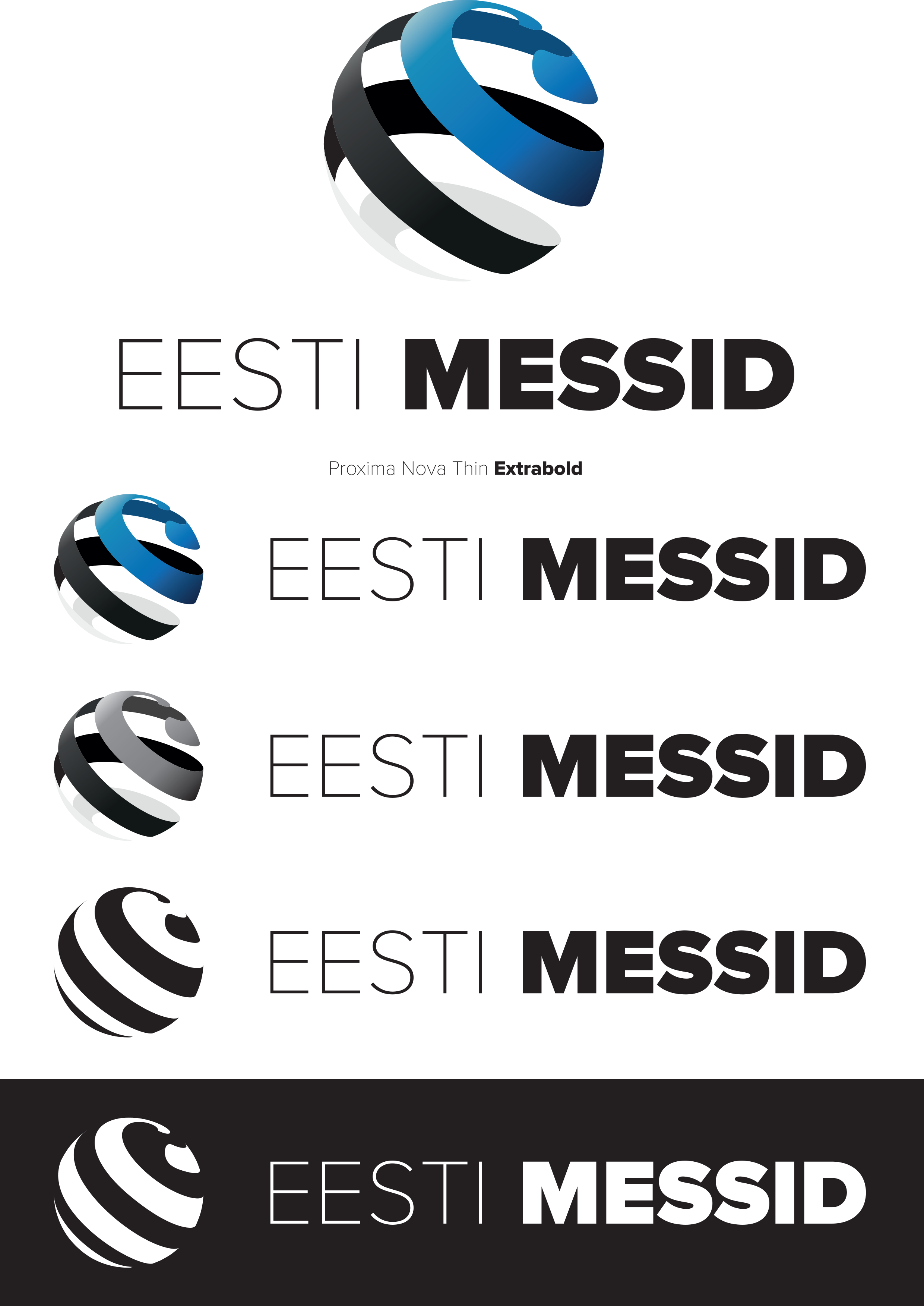 A globe-shaped spiral ribbon in the colors of the national flag of Estonia symbolizes the capability of Estonian entrepreneurs for successful activity in the Estonian domestic market and also abroad. It is suggested to use the logo on a gray background, in order for the lighter parts of the sphere to become distinctive. The tone of the gray background is defined as 40% black or C0;M0;Y0;K40; in process colors.